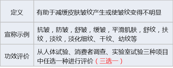 皱纹是人体皮肤生理特征,只可延缓产生和淡化,但不能根除,所以不能使用祛皱、去皱、除皱等夸大性功效宣称。